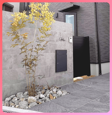 東洋石創のリジットやタカショーのセラレバンテなど、大判タイルを使用することで高級感を演出。色味もグレーでまとめることで、お住まいの外壁とも相性抜群!