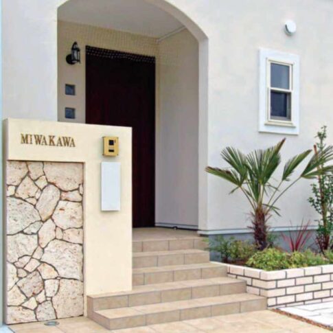 こだわったのが門まわりの部分です。ポーチにつながるアプローチにはユニソンのティーナを敷き詰め、仕切りにはミルドブリックを小端建て。造作門塀にはユニソンのパイルストーンを採用。