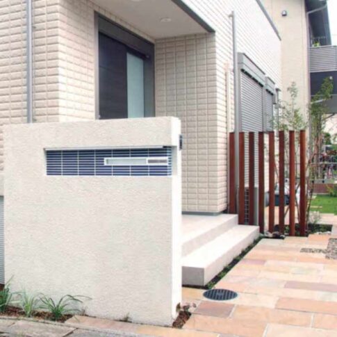 造作門塀(ブロック8段積、ジョリパッド仕上げ)、タイル(ユニソン:パイルストーン)、宅配ポスト(ユニソン:コルディア)、アーチ(LIXIL:Gフレーム)