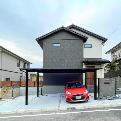 その秘密は、二段重ねの造作門塀。この独創的なアイデアにより、予算を抑えつつも、訪れる人の記憶に残る、唯一無二の外構デザインが完成しました。シンプルでありながらも、洗練された素材選びとデザインの工夫で、広大な敷地を最大限に活かし、お客様だけの理想を追求しました。
