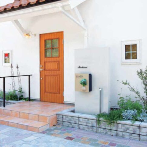 造作門塀タイル仕上げ(タカショー:セラレバンテ)、表札(東洋工業:コナロ)、ポスト(東洋工業:エメール)、割栗石