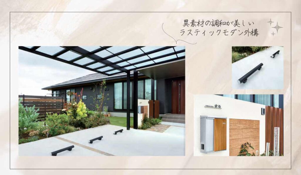落ち着いたモノトーンの外壁に、木調フェンスや植栽のグリーンが映えるスタイリッシュな外構。タイルやガラス、金属など異素材をバランスよく組み合わせることで、シンプルながらも深みのあるデザインを実現しています。