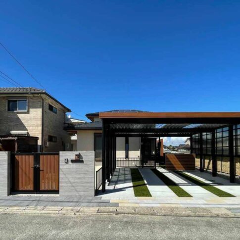 スタイリッシュなカーポートを中心に、建物のデザインと調和する開放的なナチュラルモダン外構をご紹介します。