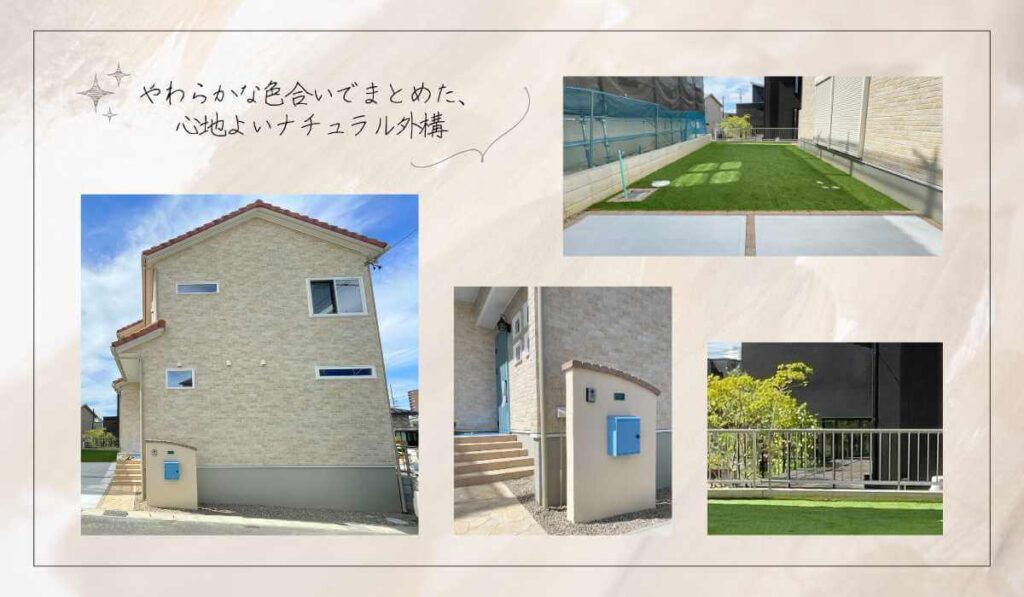 やわらかなベージュ系の外観に合わせ、外構全体を明るく統一感のあるトーンでまとめました。